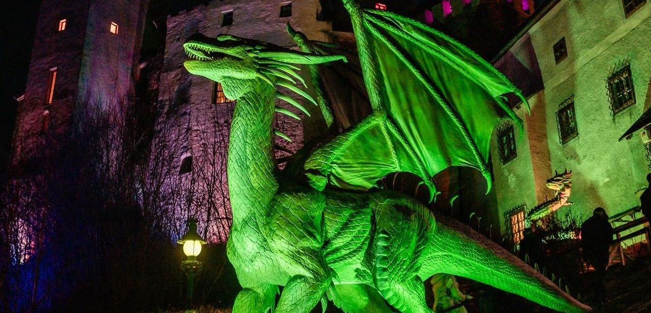 Atmosphärische Lichtshows unterstreichen geheimnisvolle Geschichten jedes einzelnen animatronischen Drachenmodells